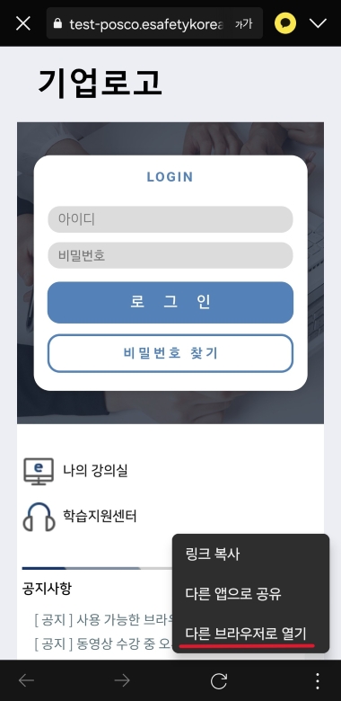 안정적인 수강을 위하여 크롬(chrome) 브라우저 앱을 통하여 수강해 주시기 바랍니다.